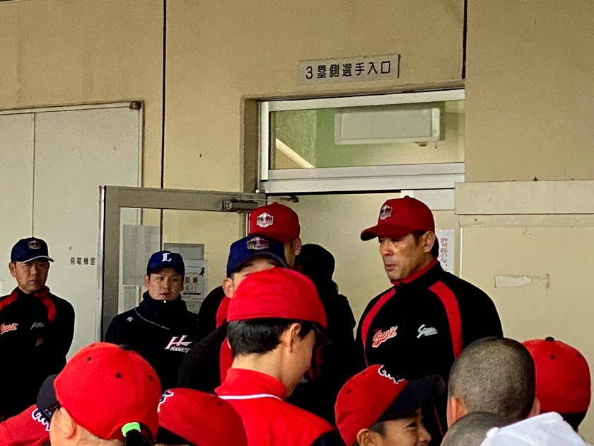 あいにくの雨模様でしたが、球場の外でも、熱く指導しておられました。