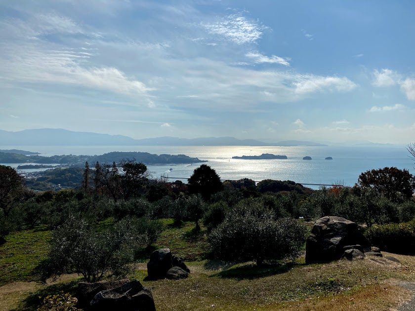 香川県もみえます。オリーブに囲まれた絶景で、おっさんず も大満足。