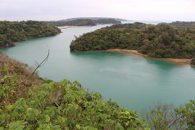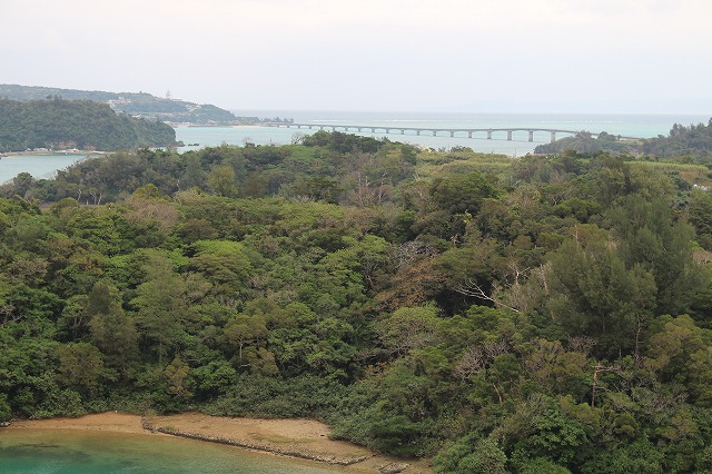 途中のワルミ大橋で撮影。右上の古宇利大橋の向こうが古宇利島。