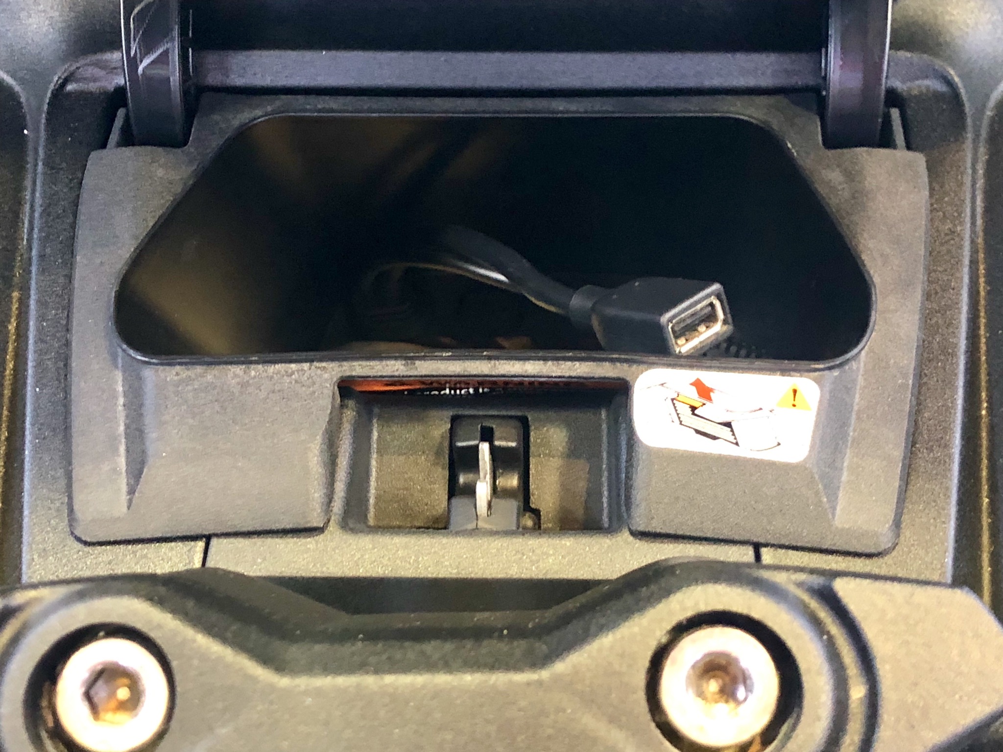 USB、AUX接続ケーブルはハンドルポスト前の