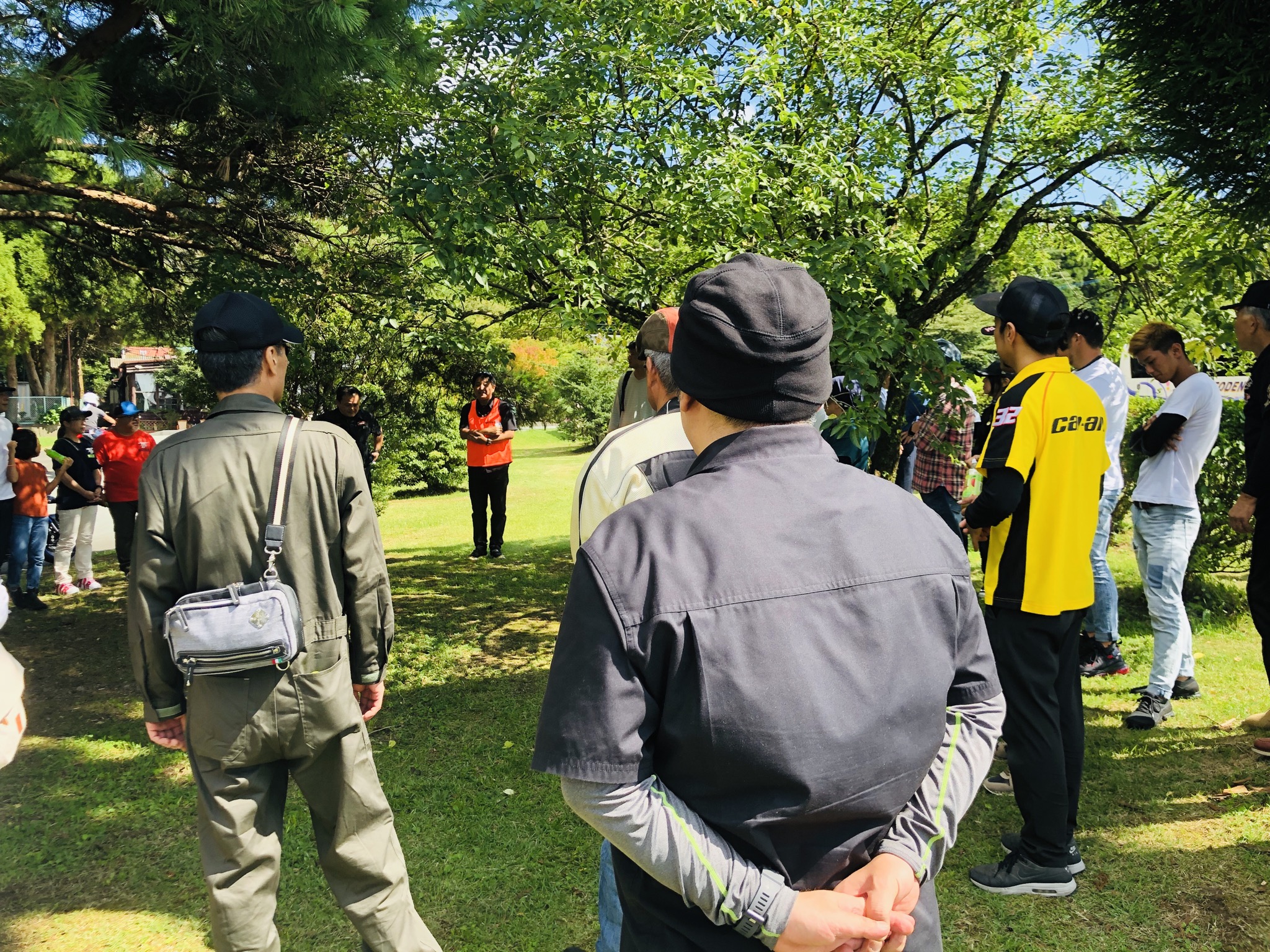 快晴のため、木陰で出発前のミーティング。