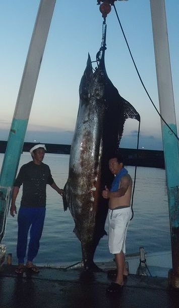 右の写真は夏に釣上げられた497.8キロ。