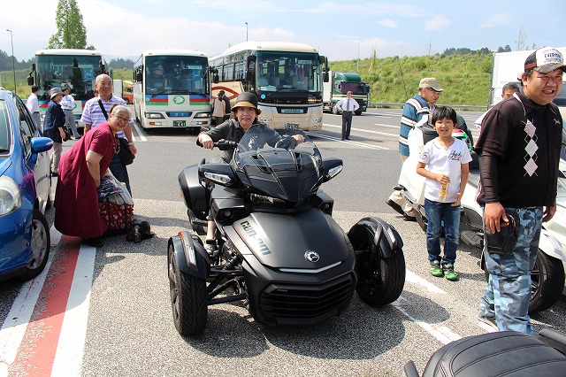 土山インターチェンジでは無く、サービスエリアで休憩します。子ども、お年寄りを引き寄せる魅惑のフェロモンを持つ準スタッフ(写真左)