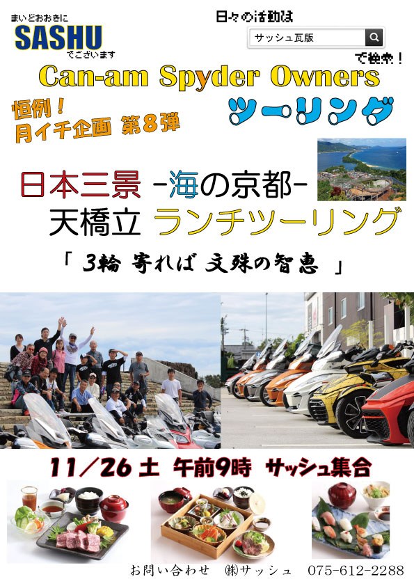 来月11月は「天橋立ツーリング」です!26日(土)9時集合です。